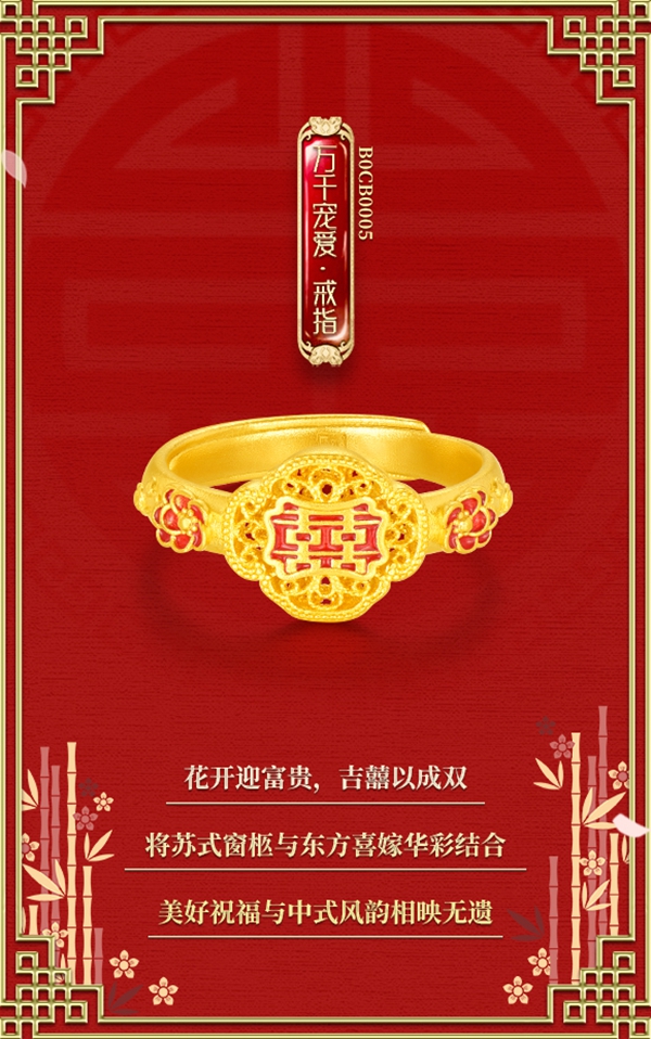 周大生宁波万工轿国家宝藏联名黄金婚嫁套系“万千宠爱”,取轿上龙、凤、牡丹等元素,打造珐琅和素金两版产品,满足不同审美需求,实现新娘对于中式婚嫁的美好期待。万千宠爱项链以喜轿为契,将吉囍元素錾刻于饰,经典如意锁与时尚花边设计相结合,辅之中式对称花丝流苏,寓意好事成双,颂祝人生喜事,诠释万千宠爱;“为君撷取钗头凤,云鬓花颜金步摇” 万千宠爱套系凤簪取轿上喜凤,缀以“囍”字流苏,凤尾灵动富丽,寄意从此三千情丝为君独挽,愿夫妻琴瑟和鸣;万千宠爱耳饰取自轿上牡丹盛放之态,以花丝织就更显立体饱满,珠链流苏轻盈精致,寓意新娘容颜美貌,姿态高贵;套系手镯取轿上“囍上梅梢”元素,内壁辅以无双匠艺,织就富丽花丝,传承中式“金凤颂喜”元素,彰显与生俱来的大气与矜贵;万千宠爱戒指则是将苏式窗柩与东方喜嫁华彩相结合,经典中式设计延续传统婚嫁的隆重端庄,兼具现代审美的优雅,美好祝福与中式风韵相映无遗,期盼花开迎富贵,吉囍以成双。
