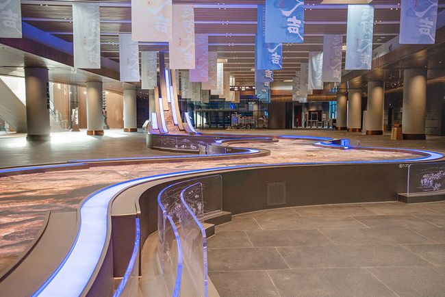 展厅正中的运河之魂LED屏以其流水装置屏的形式,展现了“一脉承古今,一眼三千年”的影像主题。这里,河流不仅是地理上的纽带,更是文化与历史的传承载体。