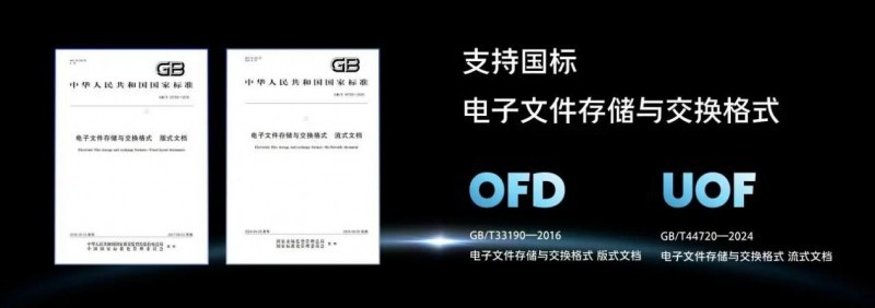 支持国标电子文件存储与交换格式,能够导入、导出UOF标准的UOT格式流式文件,以及导出OFD格式版式文件。