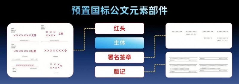 方正飞翔龙腾文印版预置六款国标模板,使用单位可以根据需求创建单位内部的模板库,也可以利用部件库功能,将制作好的红头、署名签章、版记存入部件库,相同的版式不需要制作多个模板,只需根据使用需求更换部件。