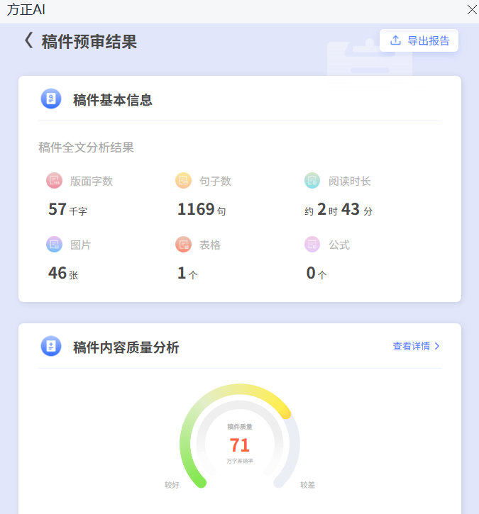 高效的稿件筛选是提升编辑工作质效的第一步。如何在盈千累万的稿件中快速筛选出符合出版要求的稿件呢?方正智能辅助审校系统的预审报告功能来助力。该功能可以智能化地从稿件基本信息、内容质量、内容结构以及内容合规性四个维度对稿件进行分析总结,以翔实依据协助编辑快速判断稿件是否符合出版规范与质量要求,进而有效筛选出优质稿件,提高稿件处理效率。